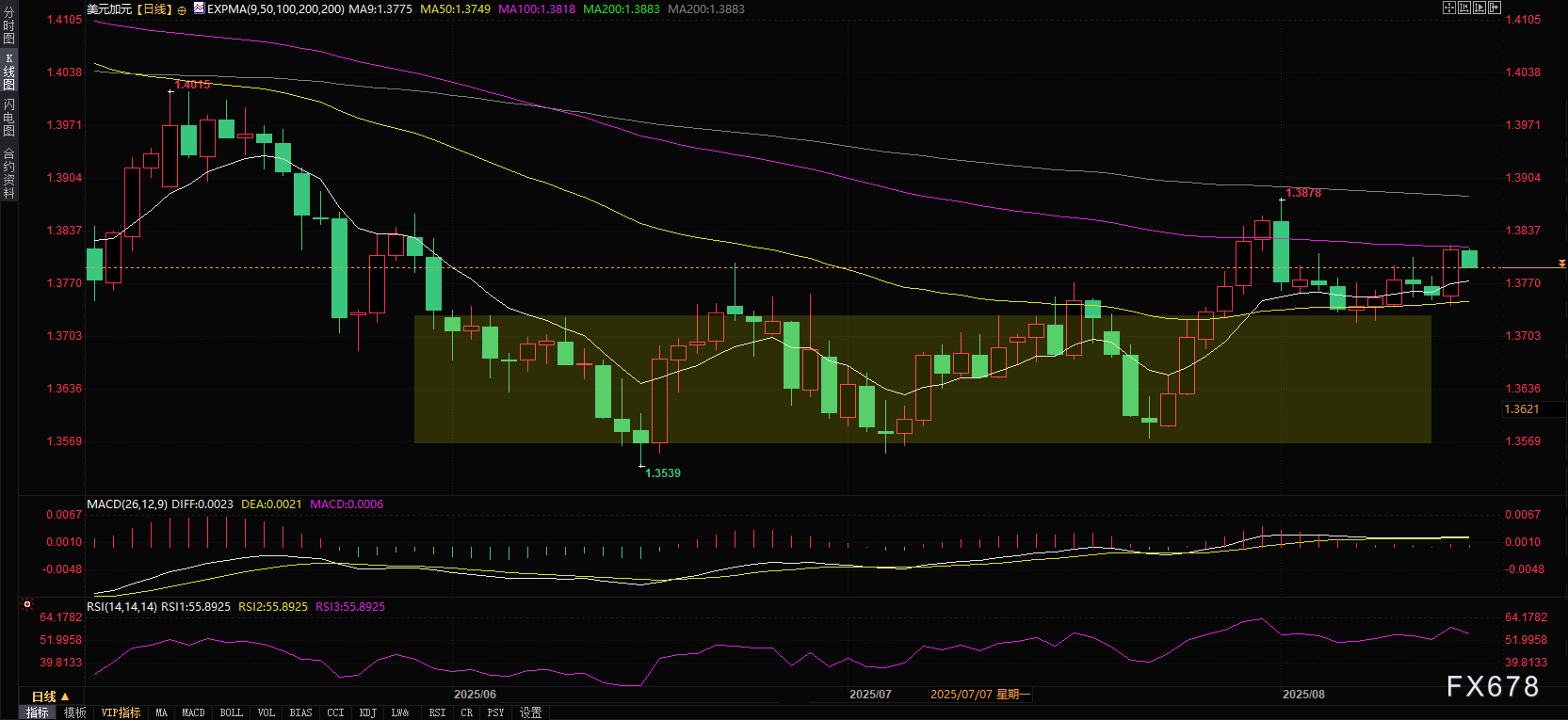 美元兑加元正试图突破100日均线(当前位于1.3818)延续上行趋势。14日相对强弱指数(RSI)已升至60关口附近,若突破该水平将确认新的看涨动能。
