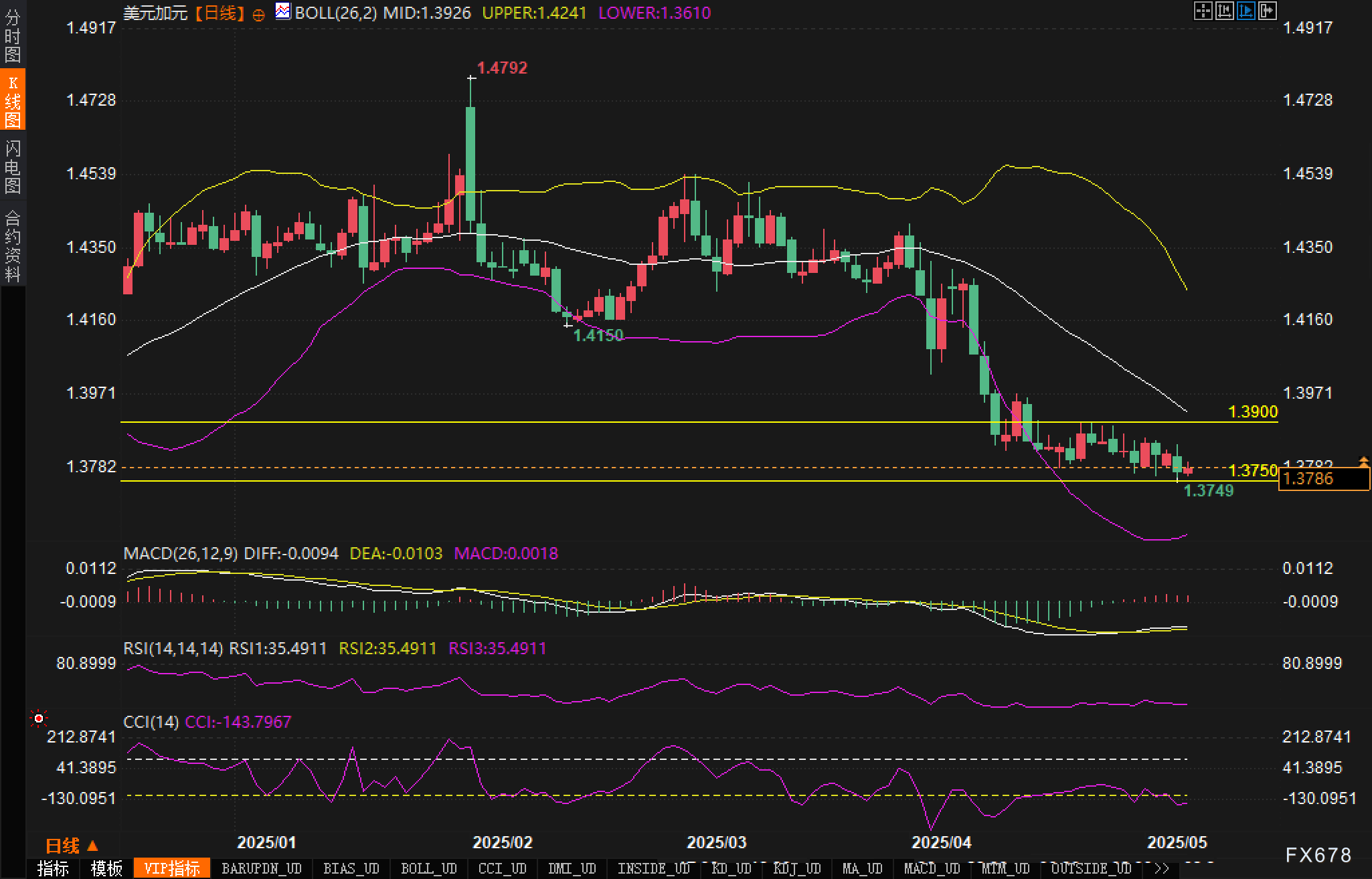 基本面分析 美元/加元目前处于关键节点,美联储利率决议将成为近期市场焦点。交易员普遍预期美联储将在本次会议维持利率不变,但市场更关注鲍威尔在记者会上的表态,尤其是针对关税不确定性和来自特朗普要求降息的政治压力的回应。 另一方面,加元近期表现出一定韧性,这主要归因于加拿大总理马克·卡尼与美国总统唐纳德·特朗普举行的联合新闻发布会后风险情绪有所改善??崴婧蟮ザ谰傩屑虮ɑ?,澄清了美加初步贸易讨论的基调。 卡尼表示:"谈判具有建设性。特朗普和我同意在未来几周内恢复讨论,并在G7峰会上进行后续会晤。尽管今天没有就关税作出决定,但双方都致力于推进对话。" 然而,加拿大国内数据对加元构成压力。4月份加拿大经季节调整的Ivey采购经理人指数大幅低于预期,从预测的51.2降至48.0,这表明商业情绪正在恶化。 技术面分析师解读: 美元/加元日线图展现出明显的下行趋势,连续跌破多个关键技术指标。价格自1.4792的高点开始大幅下挫,目前已下跌约1000点,显示出强劲空头势能。