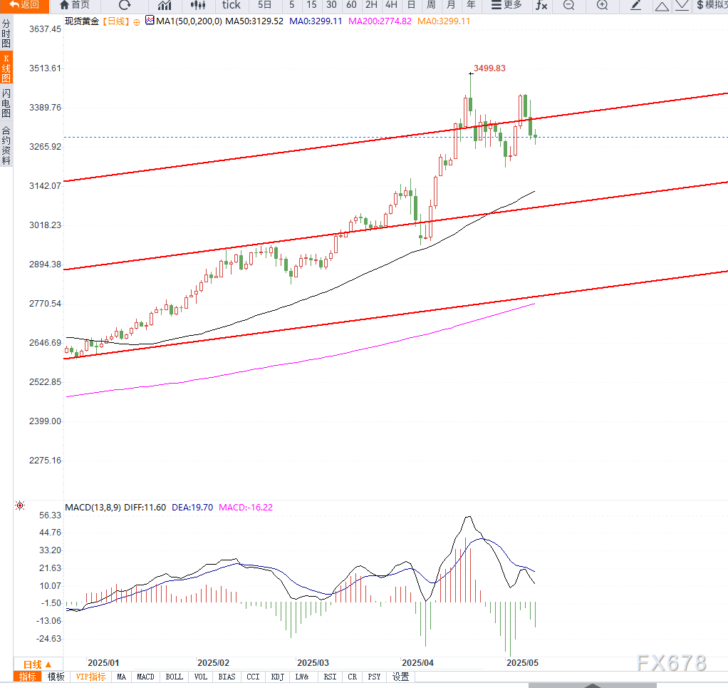 布林带轨道呈现收窄态势,显示市场进入整理期。若金价能有效突破3350美元前高,下一目标将指向3400美元关口;若跌破3270美元支撑位,短期内或向3200美元寻求支撑。整体来看,黄金短期走势偏强,但技术形态提示需防高位震荡回落风险。