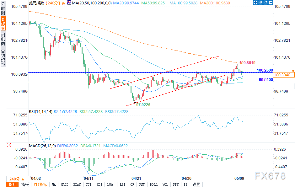 Pepperstone激石——周五(5月9日)美盘时段,美元指数走跌,盘中报100.2794/2967,跌幅0.34%。