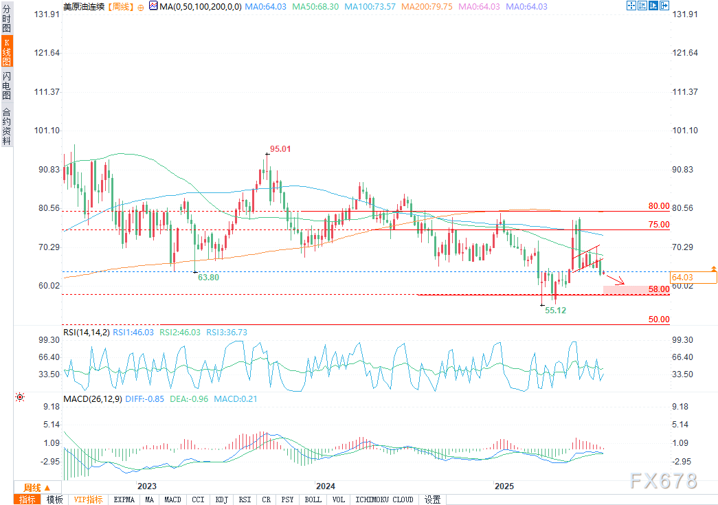 Pepperstone激石——自7月高点以来,油价已下跌近10%。欧佩克(OPEC)增产,以及特朗普与普京会谈可能降低对俄罗斯石油制裁的预期,均对原油价格构成压力。周线图走势表明,在形成周期低点之前,油价可能还有更多下行空间。