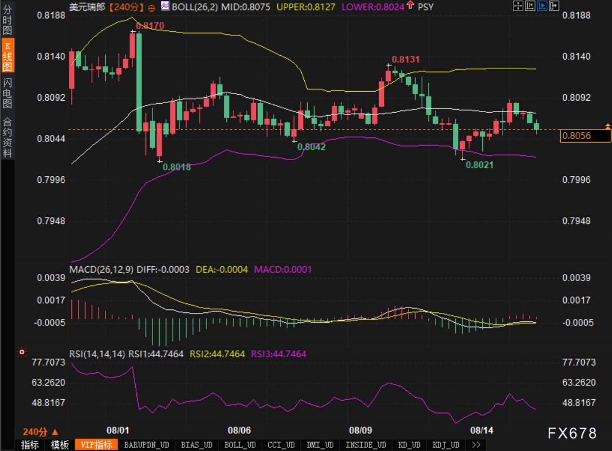 根据图表数据,USD/CHF呈现一定的震荡走势,当前汇价在0.8000至0.8100区间波动。布林带显示汇价逐渐接近下轨,并且波动性减弱。技术指标MACD显示,当前走势处于弱势区间,DIFF线位于DEA线下方,形成空头信号,且MACD柱状图持续萎缩,表明市场短期内仍有下行压力。
