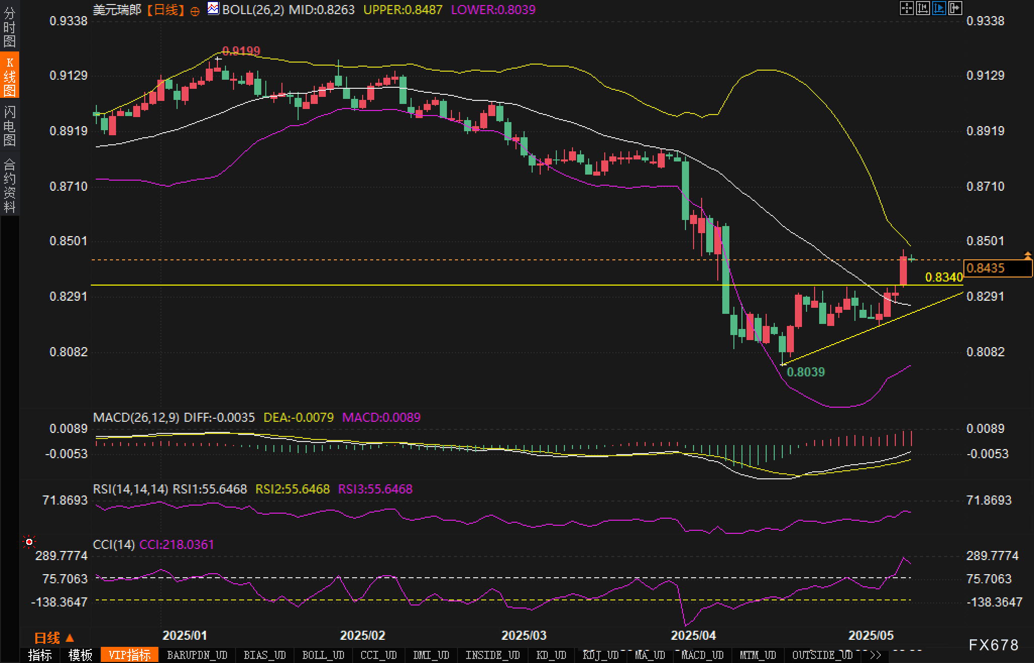 从美元/瑞郎的日线图技术分析来看,汇价正处于关键的转折点。经历了4月的大幅下跌后,价格已在0.8039筑底并形成了明显的上升三角形整理形态。这种技术形态通常预示着上行突破的可能性增大,尤其是在之前出现强劲下跌趋势的情况下。