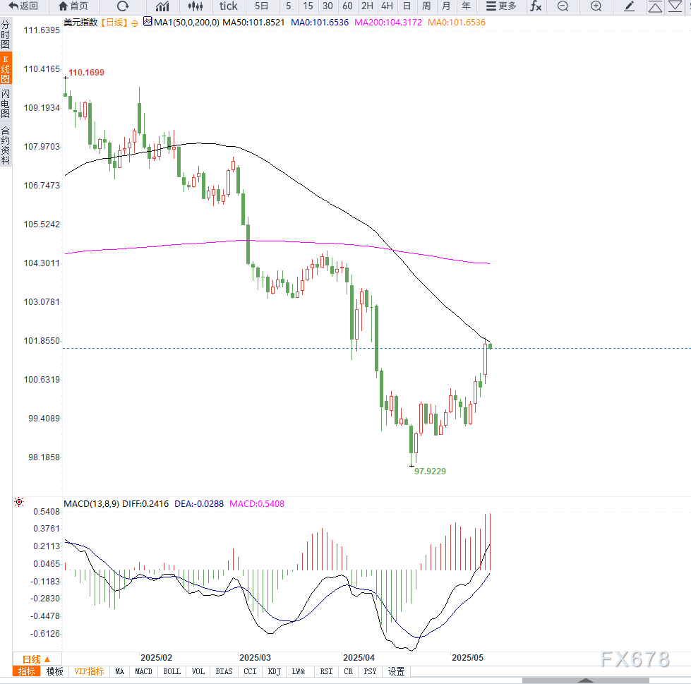 技术层面来看,美元指数日线图显示,当前价格持续上行,并成功突破前期震荡区间上沿100.80-101.20的压力位,显示多头动能逐步增强。