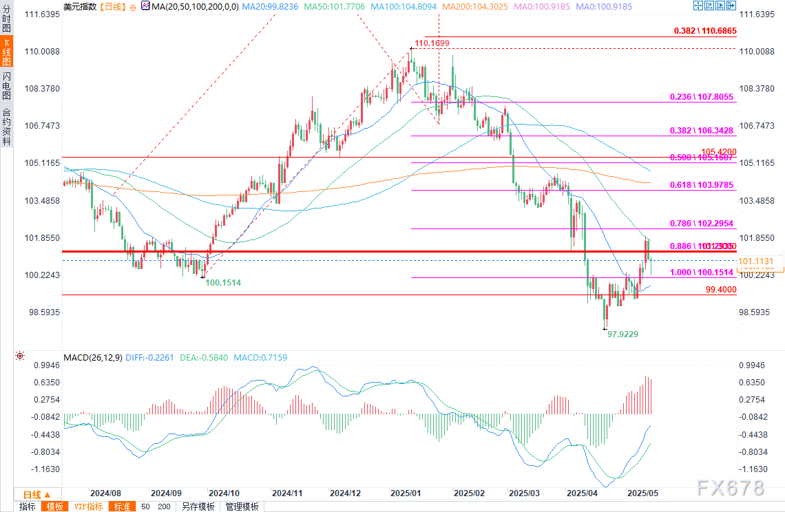 Pepperstone激石——周三(5月14日)欧盘时段,美元指数(DXY)盘中跌至100.58,下跌0.40%。此前,投资者因低于预期的通胀数据和缓和的贸易紧张局势,重新调整了对美联储政策的预期。