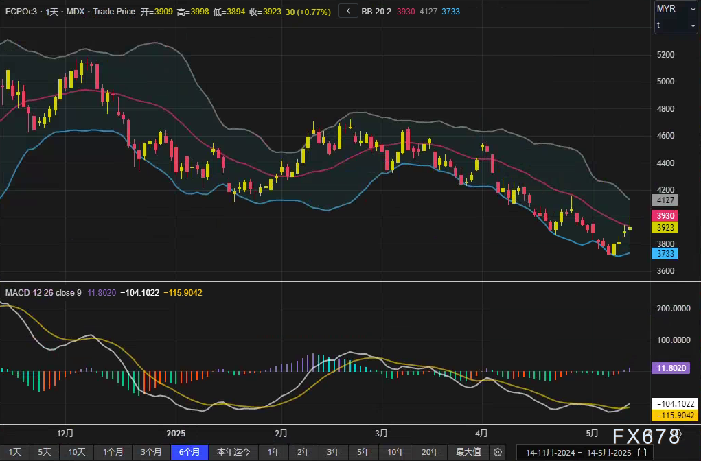 Pepperstone激石——周三(5月14日),马来西亚衍生品交易所(BMD)棕榈油主力合约FCPOc3连续第四个交易日收涨,7月合约收盘报3925林吉特/吨,日内涨幅0.82%。技术面显示,价格站稳布林通道中轨3930林吉特上方,但MACD柱状线仍位于零轴以下,反映市场反弹动能尚未形成趋势性反转。日内行情主要受大连植物油走强带动,但林吉特兑美元汇率升值0.81%抑制了涨幅。