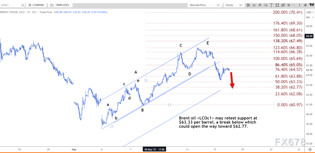 路透技术分析师指出,布伦特原油可能重新测试每桶 63.33 美元的支撑位,而跌破该水平可能打开上涨至 62.77 美元的道路。