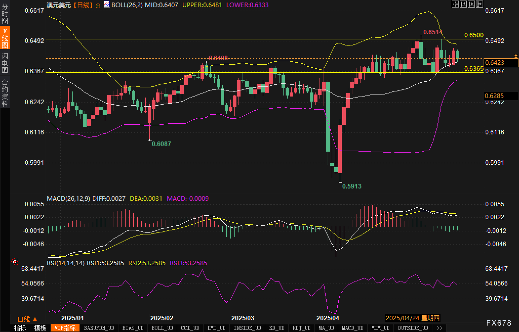 从日线图来看,澳元/美元整体呈现出上升趋势,但近期出现震荡整理态势。布林带指标显示中轨位于0.6407,上轨位于0.6481,下轨位于0.6333,汇价目前在布林带中轨上方运行,表明短期内仍维持偏强走势。图中可见0.6500为近期关键心理阻力位,汇价曾触及0.6514高点后回落,显示该水平存在较强卖压。