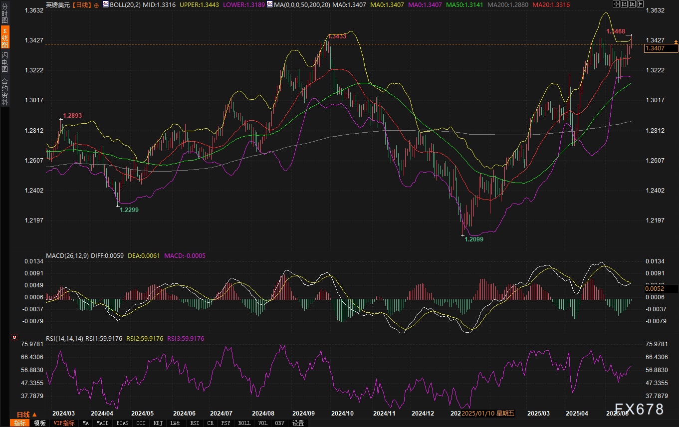 关键点位:上方阻力关注2022年1月高点1.3750,布林带上轨1.3443形成日内压制;若跌破1.3400,20日均线1.3316将成为多头防线。