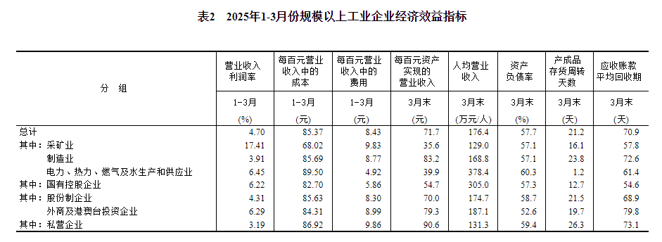1—3月份,规模以上工业企业实现营业收入32.14万亿元,同比增长3.4%;发生营业成本27.44万亿元,增长3.6%;营业收入利润率为4.70%,同比下降0.12个百分点。