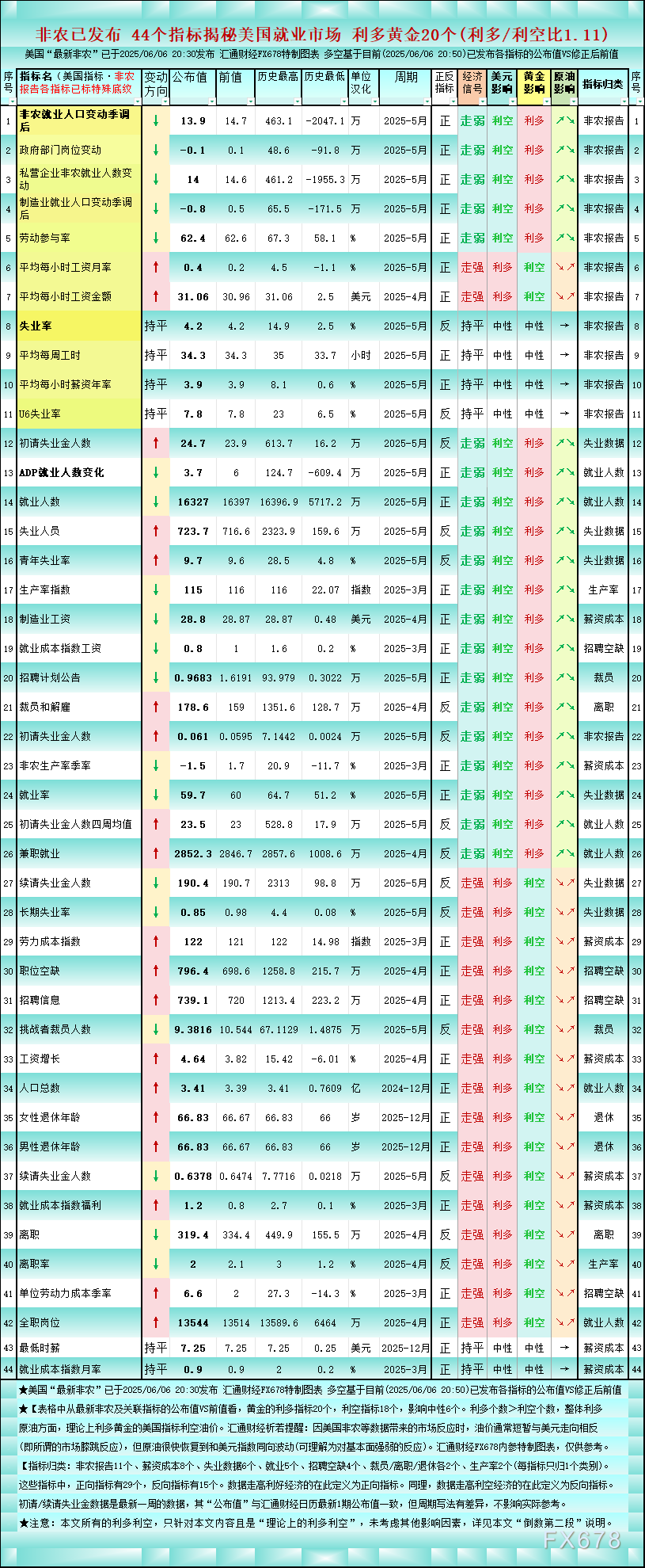 Pepperstone激石——一张图:美国非农已发布 44个美国就业关联指标 利多黄金的20个。美国“最新非农”已于2025/06/06 20:30发布,市场密切关注??俺平鹑谑谐”乇复蚩ǖ拿拦桥?此次非农后44个美国就业指标整体如何?一张图让您一目了然。