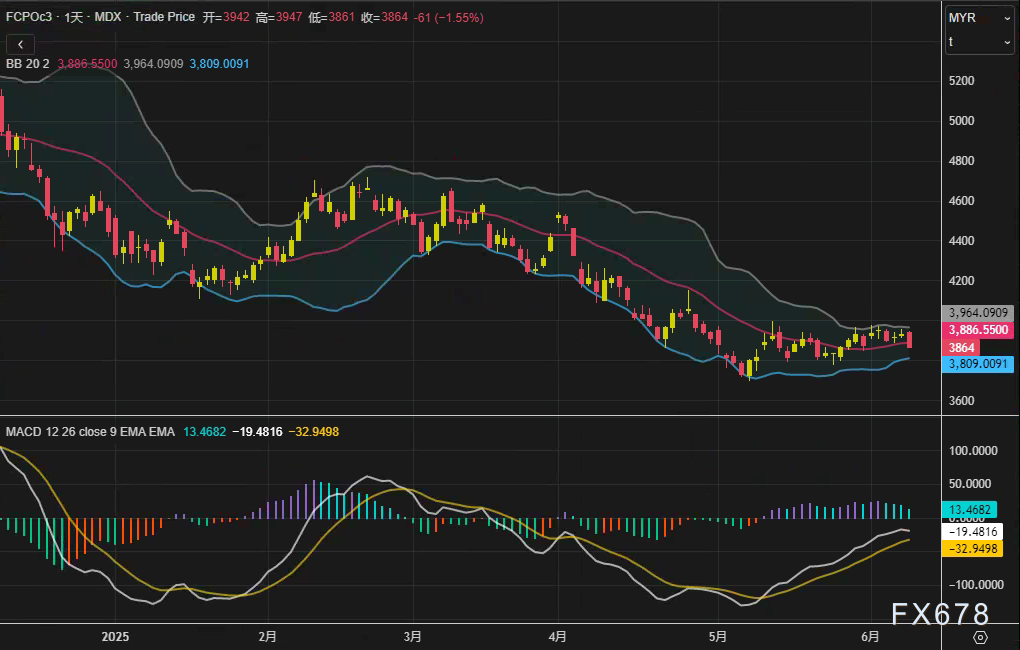 Pepperstone激石——周二(6月10日),马来西亚衍生品交易所(BMD)棕榈油主力合约FCPOc3收于3864林吉特/吨,日内下跌61林吉特(1.55%),终结此前两日连涨。技术面显示,布林带中轨位于3964林吉特,MACD柱状图延续负值,短期动能偏弱。尽管价格承压,但盘中受6月出口数据提振,跌幅较午盘收窄。