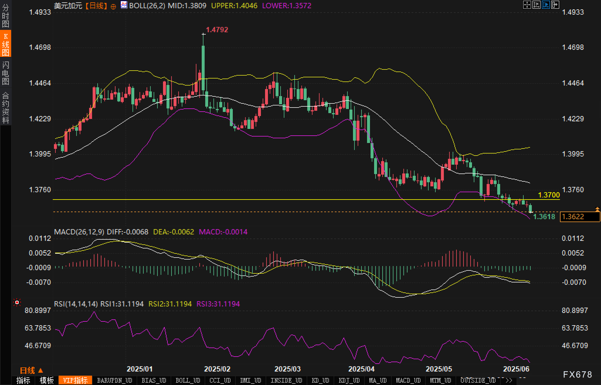 从日线图观察,美元/加元汇价整体维持在布林带下轨附近波动,布林带通道呈现扩张走势,暗示波动率提升?;慵垡训魄捌谥С盼?.3700,当前依然承压。
