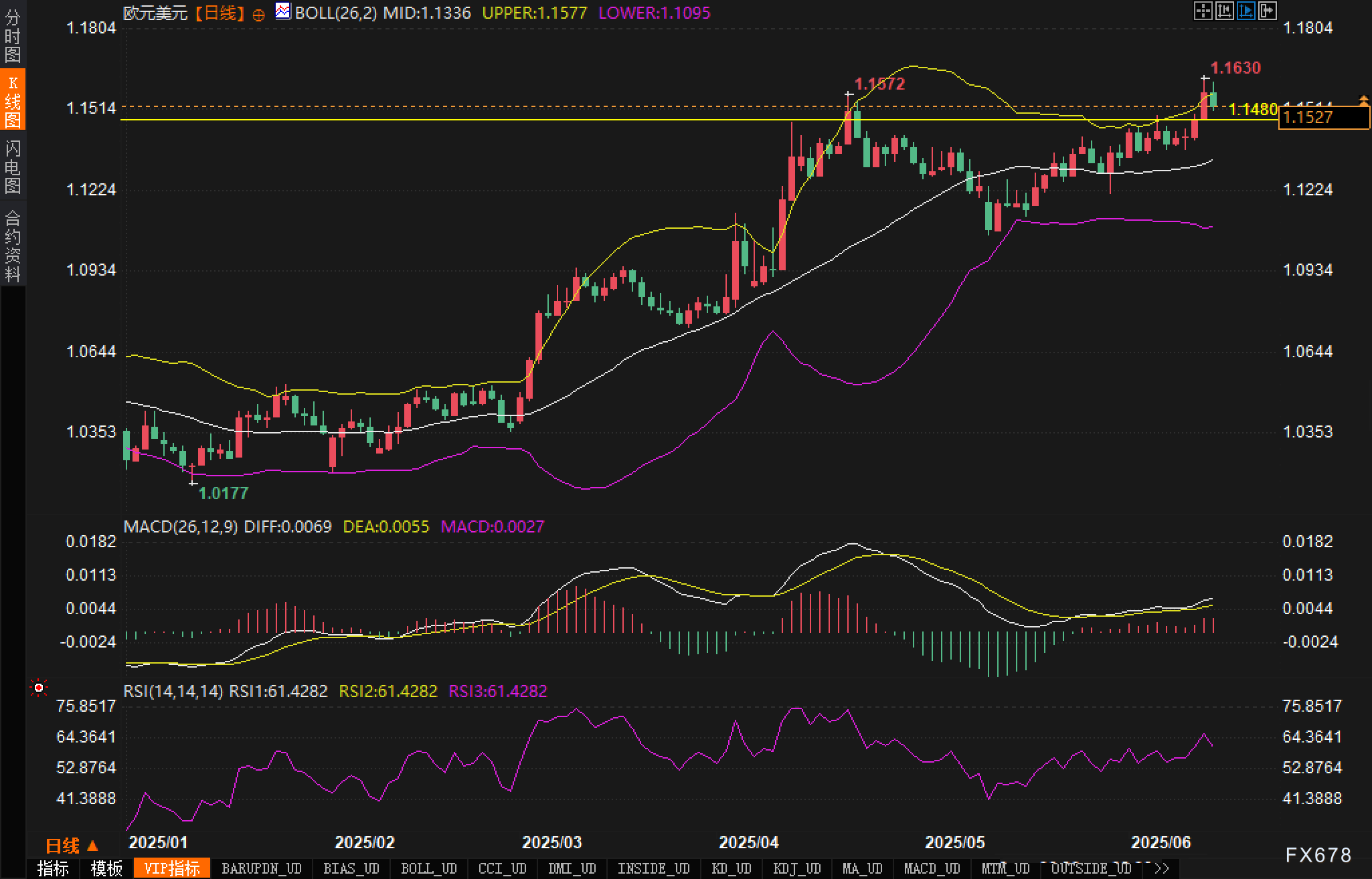 RSI指标维持在61一线,处于偏多区间,但未进一步上攻至超买区域(70以上),显示多头力量有一定保留。整体技术面倾向于短线震荡整理,交易员关注是否跌破1.1480支撑。