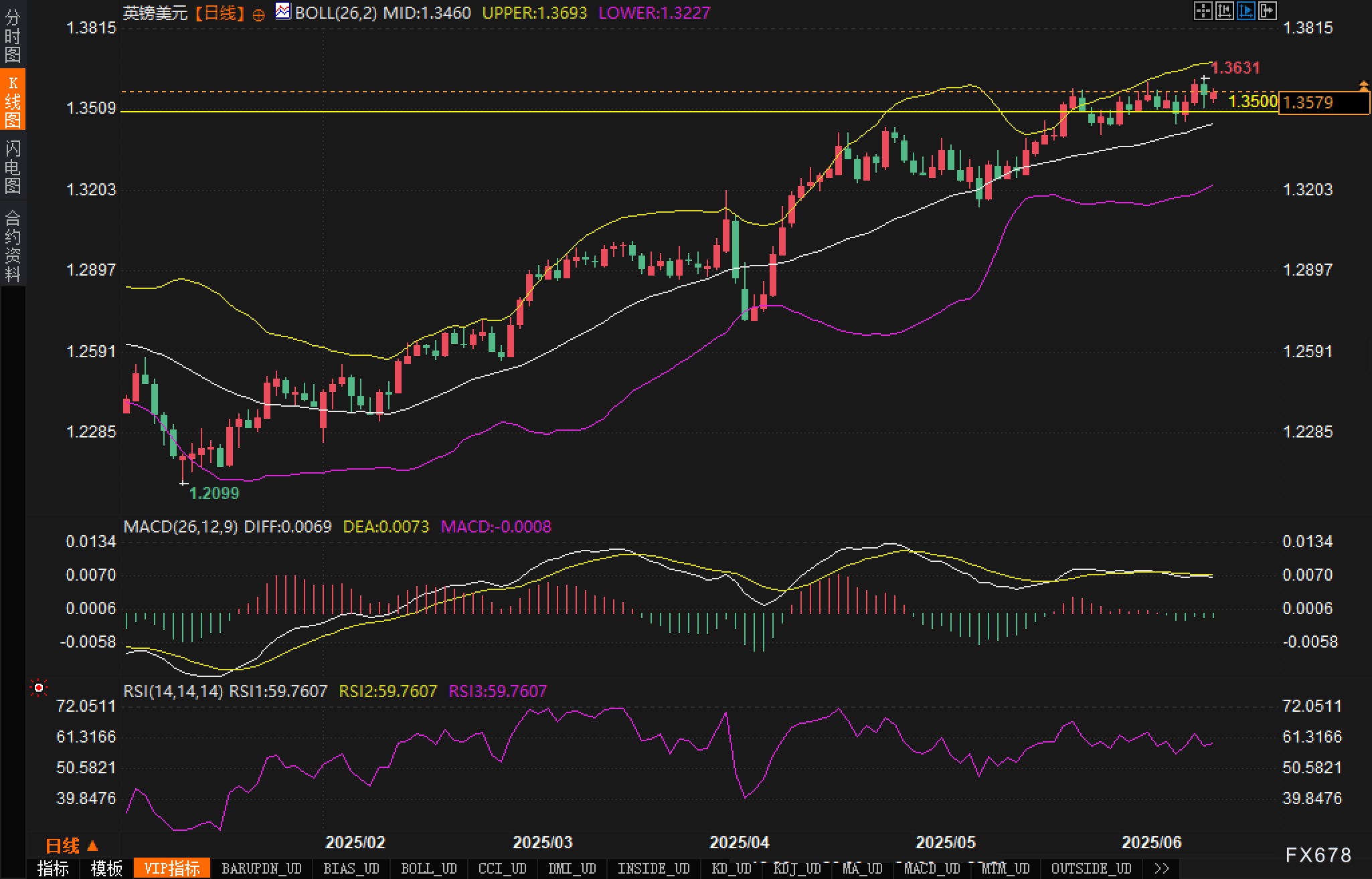 从日线图表现来看,英镑/美元延续了自4月以来的上升趋势,当前1.3630-1.3640区域形成关键阻力位,这一区间曾多次阻挡汇价上行步伐。