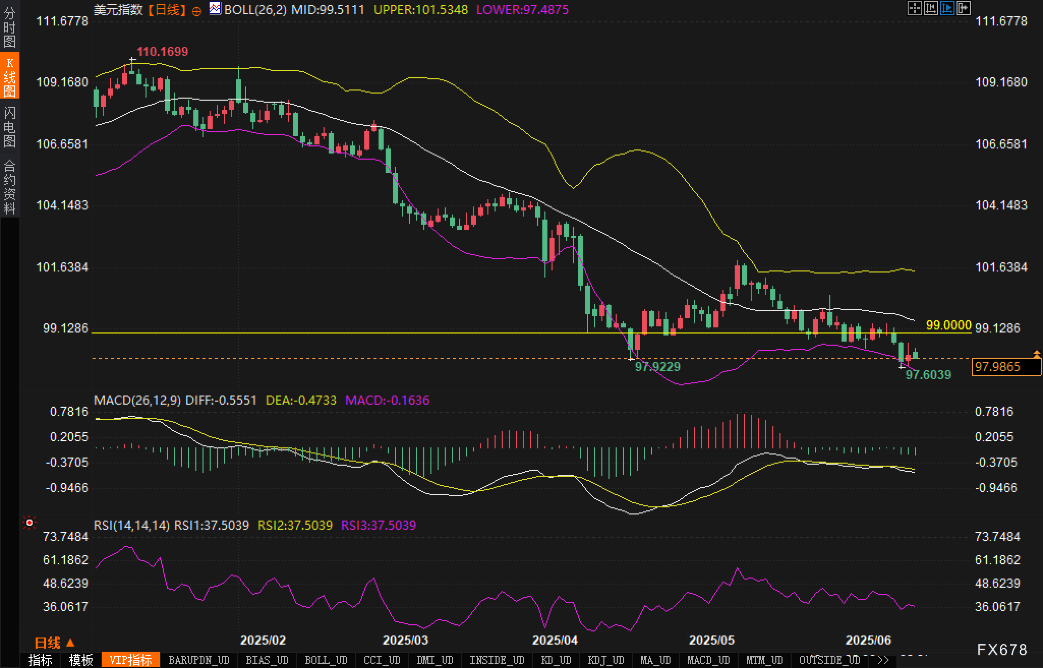 Pepperstone激石——周一(6月16日),美元指数延续疲软态势,美市盘前交投于98附近,逼近三年来的关键支撑区域。布林带收窄显示波动率压缩,而MACD指标的持续负值暴露了当前下行动能的延续性。