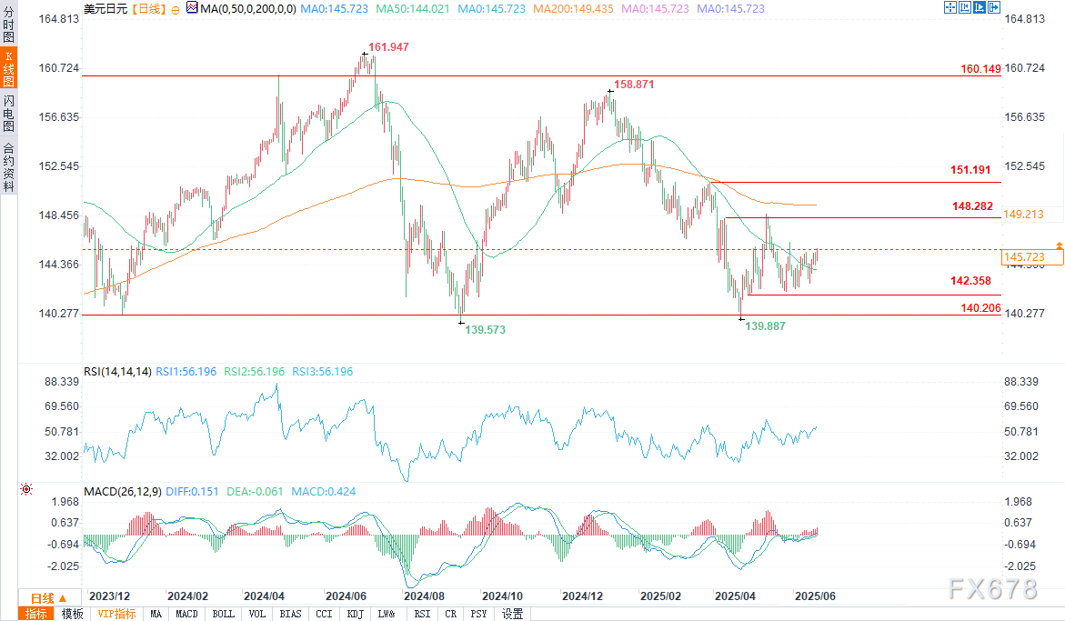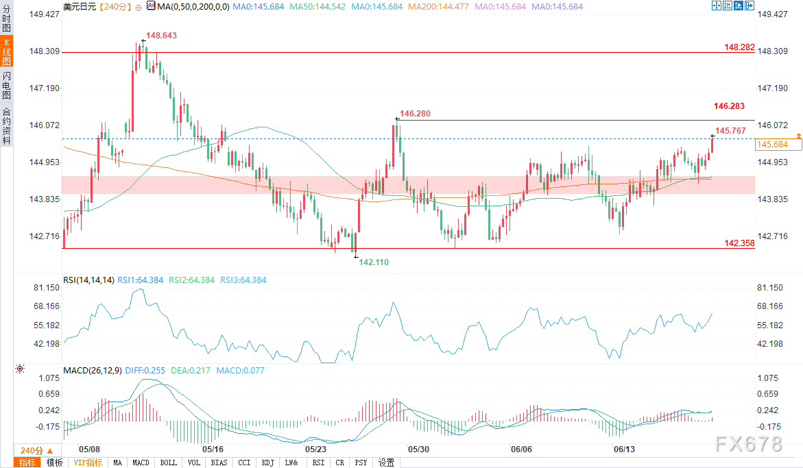 Pepperstone激石——周四(6月19日)欧盘时段,美元/日元盘中交投于145.636/49,涨幅0.36%。地缘政治担忧推动市场,在当前的避险情景下,美元比日元表现更好,美元/日元日内保持走高趋势。