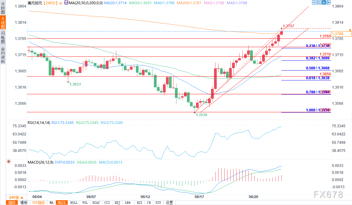 Pepperstone激石——周一(6月23日),美元/加元汇价呈现先震荡整理,后大幅拉升的走势。早盘在相对窄幅区间(1.3735-1.3756附近)波动,午后开始逐步上攻,尾盘快速冲高至1.3797,突破前期震荡区间,短期多头力量主导。在上周从今年迄今低点1.3538迅速反弹后,美元/加元巩固了涨势。