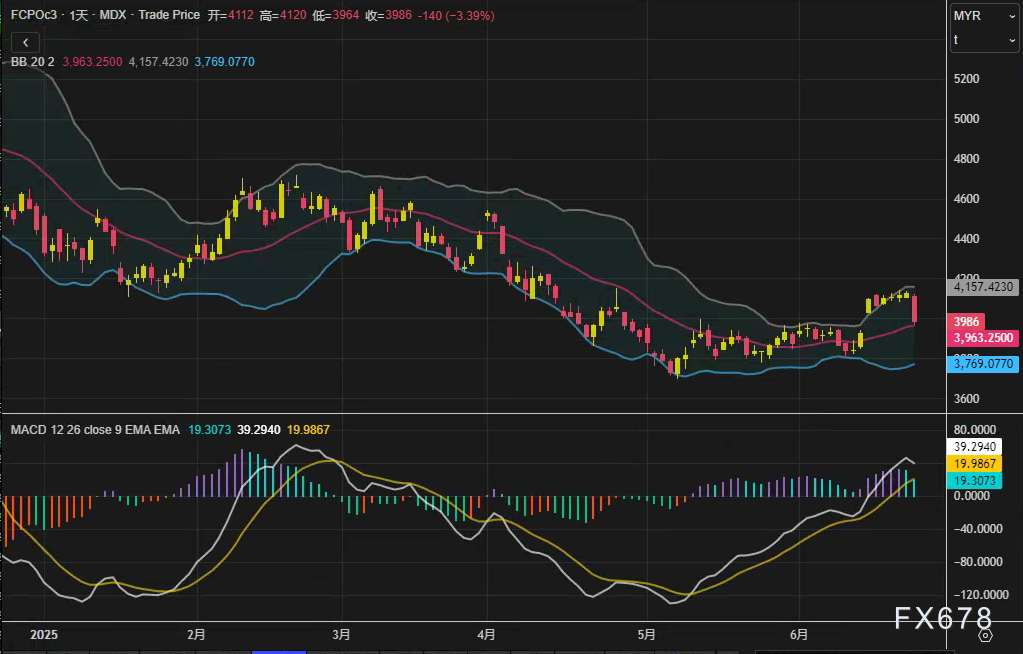 Pepperstone激石——周二(6月24日),马来西亚衍生品交易所(BMD)棕榈油主力合约FCPOc3重挫3.39%,收报3986林吉特/吨(约合940.09美元),创下自4月4日以来最大单日跌幅。此前连续四日的反弹行情戛然而止,芝加哥豆油与原油价格同步走弱成为主要拖累因素。日线技术指标显示,布林带(20,2)三轨分别位于3963、4157和3769林吉特,MACD(12,26,9)柱状图收窄至19.99,短期动能明显减弱。