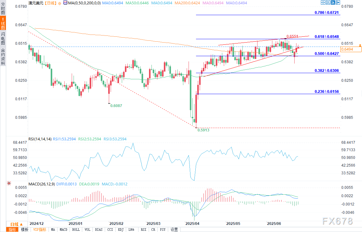 Pepperstone激石——周三(6月25日),澳元/美元价格呈现明显的震荡走势,有多次冲高回落、探底回升,显示短期多空博弈激烈。