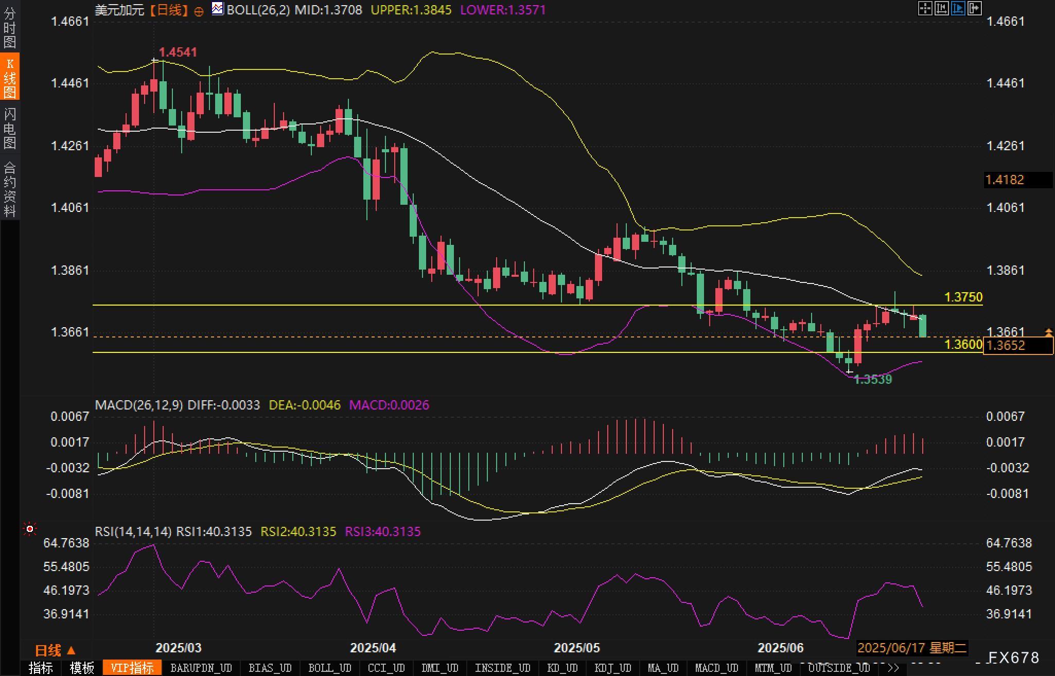 分析认为下方关键支撑位关注1.3600整数关口与前期低点1.3539形成的区间,若跌破将打开通往1.3480-1.3400区域的下行空间。上方初步阻力仍位于1.3750,若强势上破该区域,方可视作短线多头反扑的确立。